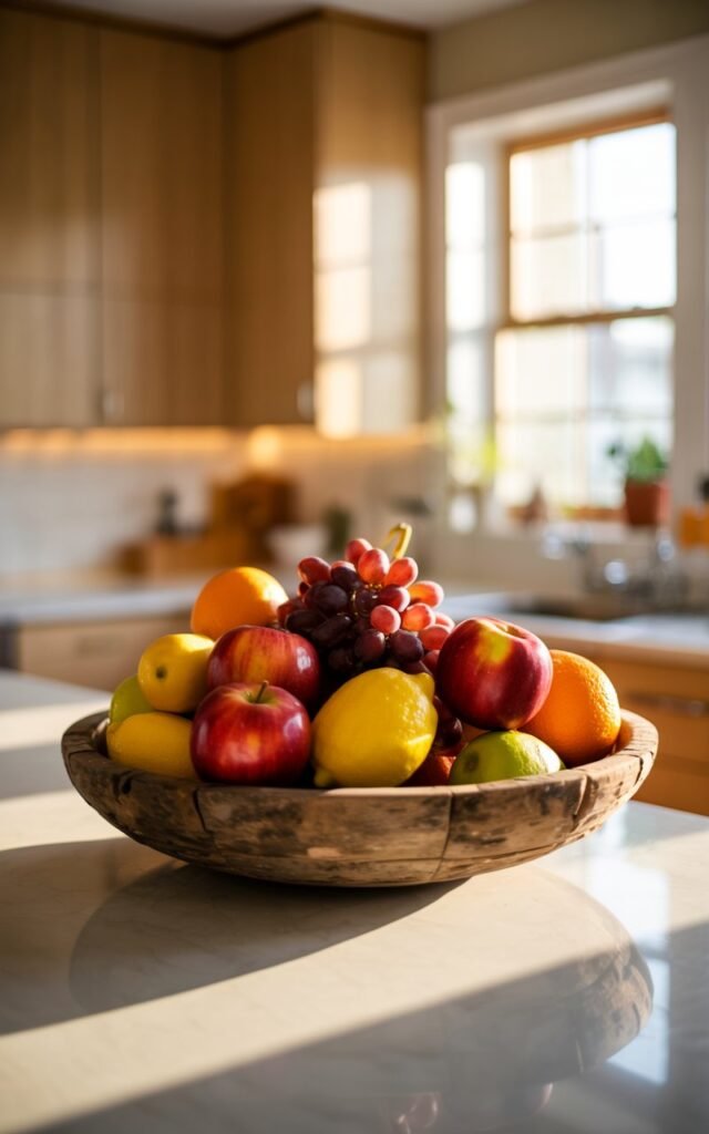 Rotate your centerpiece with the seasons — citrus and bright flowers in spring, pumpkins or candles in fall, and evergreen sprigs in winter. It keeps your kitchen decor feeling alive and refreshed all year long.