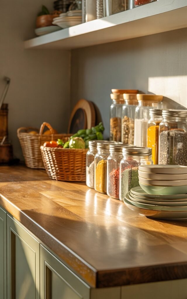 Start small — clear off your countertops and only keep what you use daily. Use baskets, trays, or jars to contain small items.