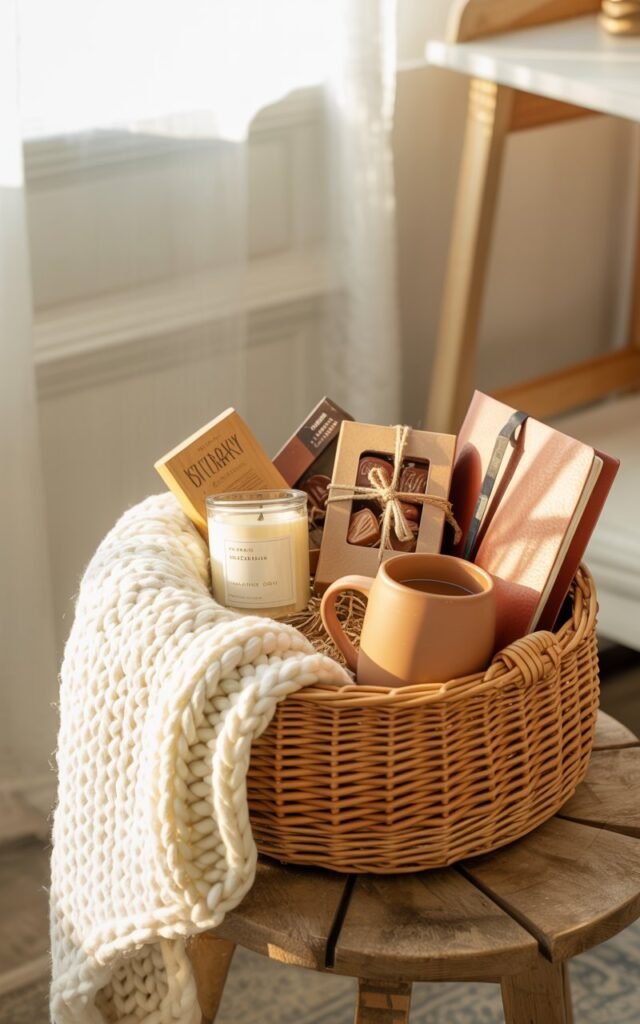 Think about their hobbies, favorite flavors, or routines. Consider what they enjoy most — reading, baking, self-care, or relaxing at home — and build your basket around that theme.