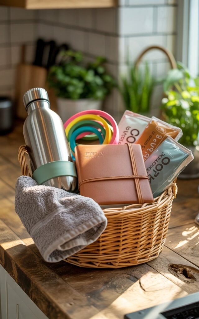 Use a sturdy, reusable tote or basket that can double as storage. Roll the exercise bands neatly and tuck snacks in visible areas. Include a handwritten note like, “Here’s to your strength — inside and out.”