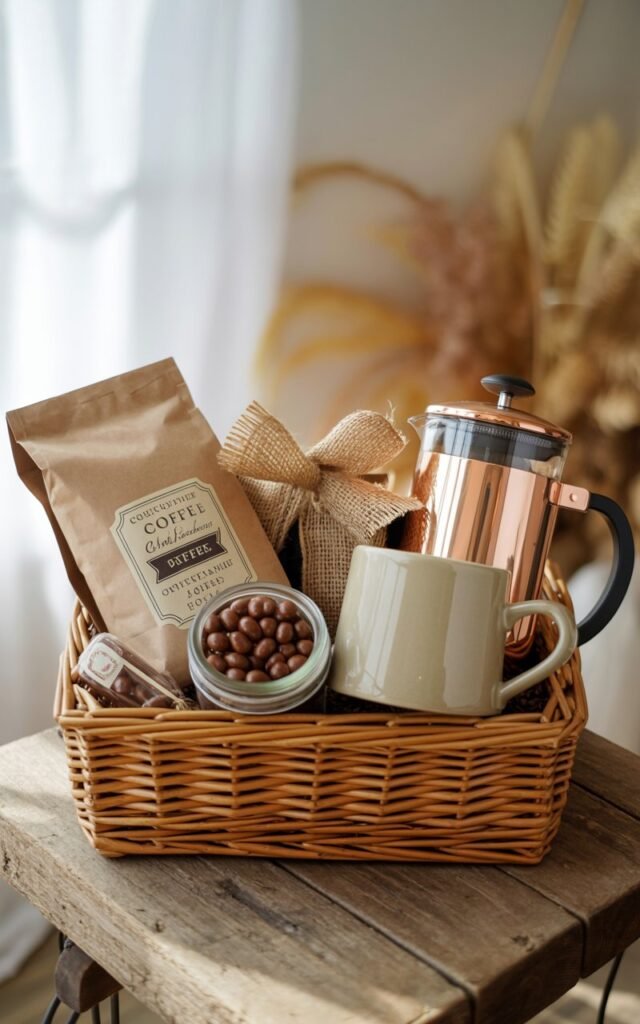 Pro tip: Add a handwritten recipe for a special coffee drink — it makes the basket interactive and personal.