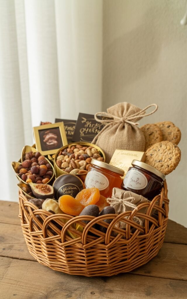 Pro tip: Choose a theme — like “French Gourmet” or “Nutty & Sweet” — to make the basket feel intentional and cohesive.
