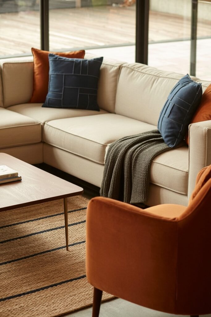 • Accent color: small items with bold patterns — pillows, throws, or decorative objects