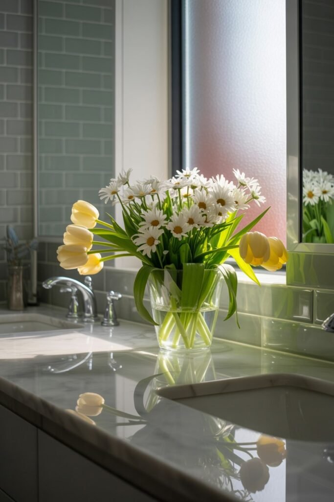 Nothing freshens a counter like a touch of greenery or a small bouquet. I love how even a tiny plant can bring life to a bathroom and make it feel more welcoming.