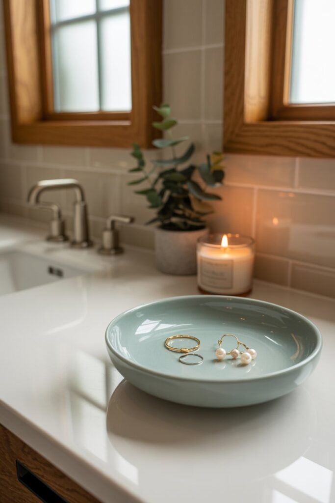If you keep jewelry or small accessories in your bathroom, a decorative bowl or tray is both practical and stylish. I started placing my rings and earrings in a small dish by the sink, and it keeps everything organized while adding a little personality to the counter.
