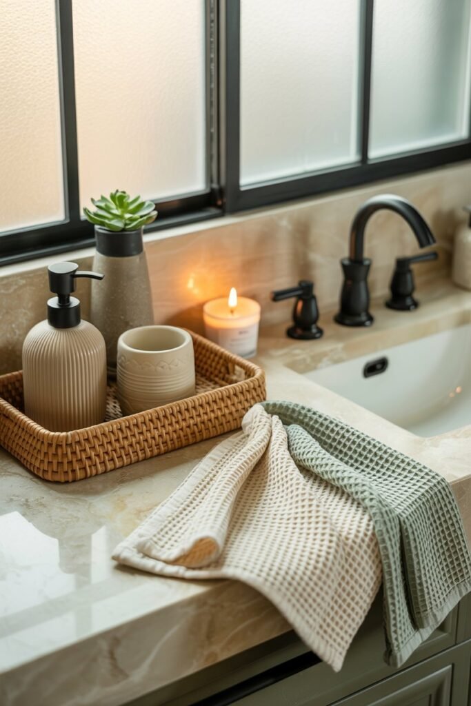 Adding texture or pattern is a small detail that makes a big impact. I’ve found that even a patterned soap dish, textured tray, or a small woven basket can break up the monotony of a countertop and add interest. These elements make the space feel curated and thoughtfully decorated.