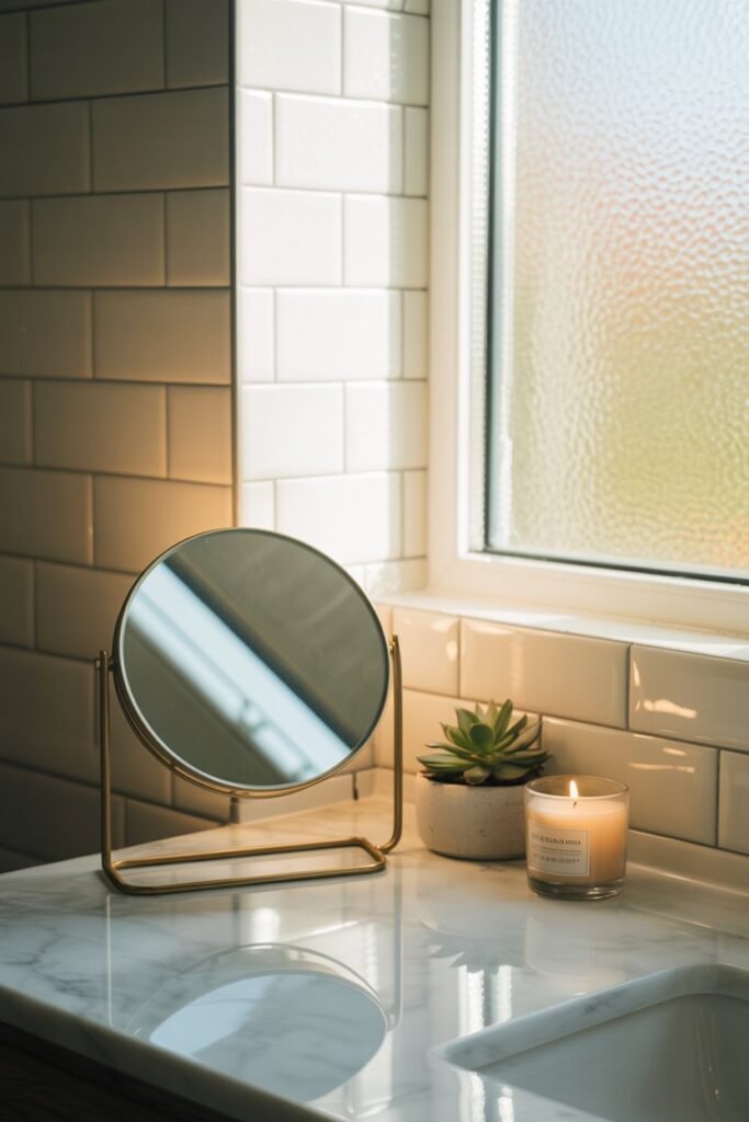 Even if you already have a main mirror, a small decorative mirror or magnifying mirror can add charm and function to your bathroom counter. I like having one for makeup touch-ups or close-up skincare routines, and it doubles as a stylish accent piece.