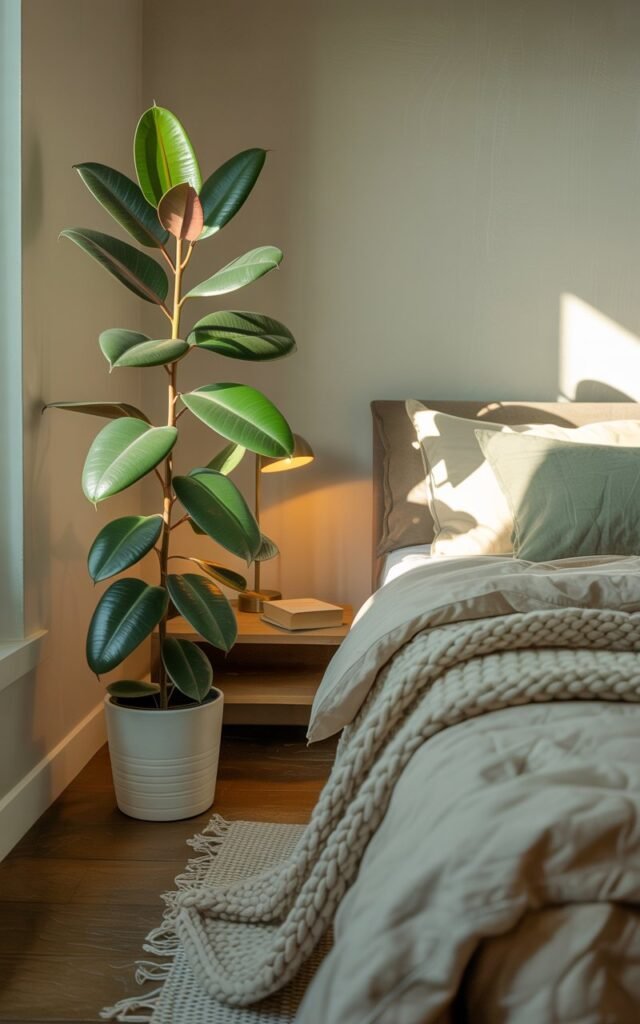 I place a medium peace lily in a corner where it gets filtered sunlight. The plant naturally filters toxins from the air, which I noticed makes waking up less stuffy and my room feel lighter.