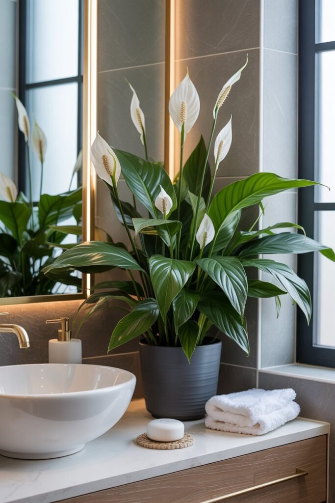 Over the years, I’ve noticed that these plants not only survive the humidity but actually thrive, creating a natural air-purifying effect while making the space feel fresh, spa-like, and inviting.