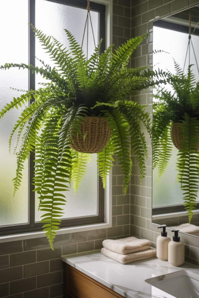 Over time, the cascading fronds create a soft, airy feel that makes even a small bathroom feel luxurious.