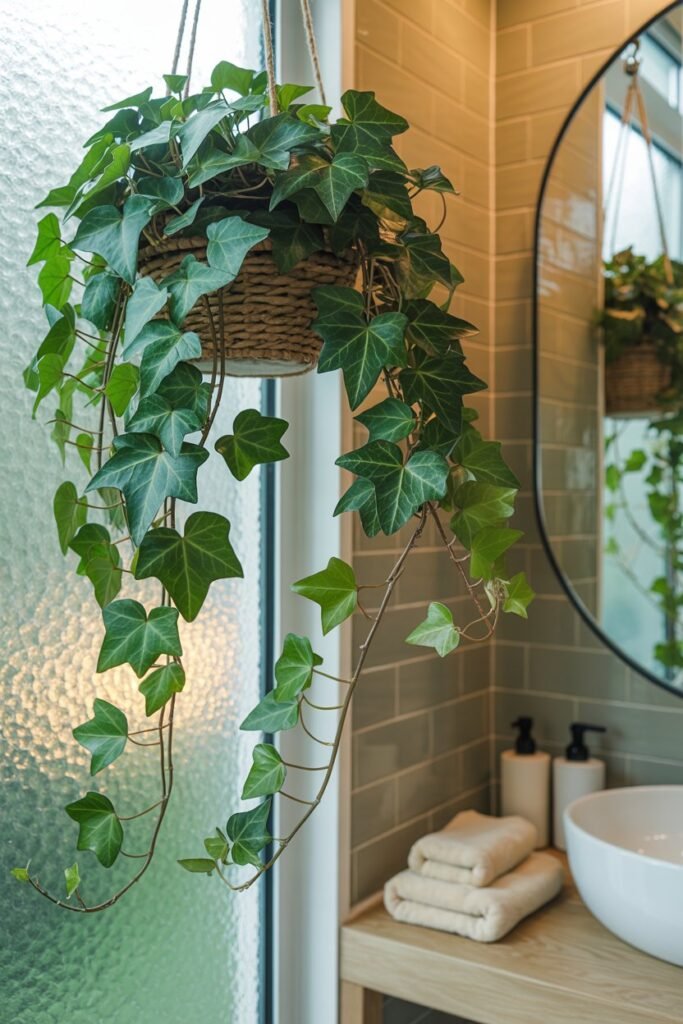 Pro Tip: Hanging English Ivy from a high shelf or letting it trail along a cabinet edge creates a natural, airy feel in the bathroom. I also like to combine it with smaller plants like ferns or succulents to create a layered green display.