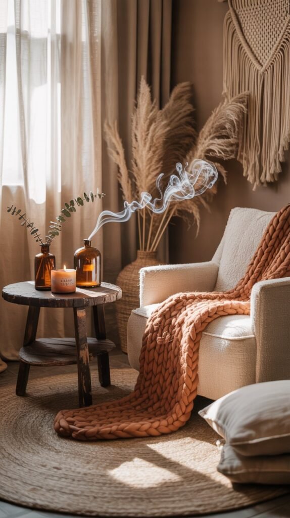 Add organic scents that connect to nature—essential oils like sandalwood, vetiver, or sweet orange work beautifully. Keep the scent subtle and steady, not overpowering.