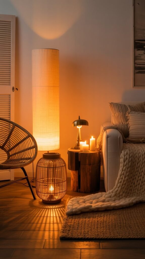 - Soft lighting—floor lamp, lantern, or candle cluster