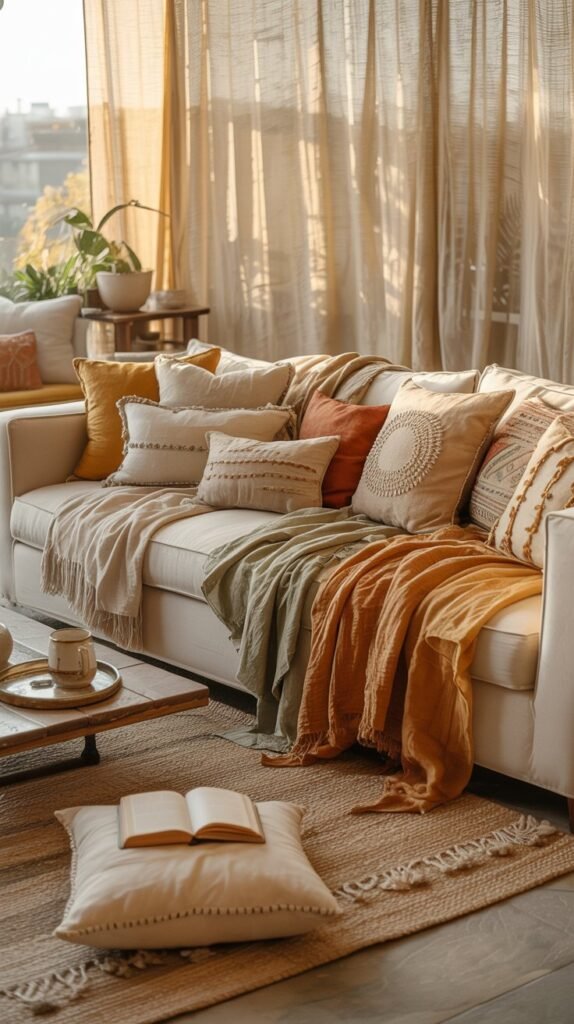 Begin with textures—mix rough (jute, linen) and smooth (silk, cotton) fabrics across your sofa, pillows, and curtains.