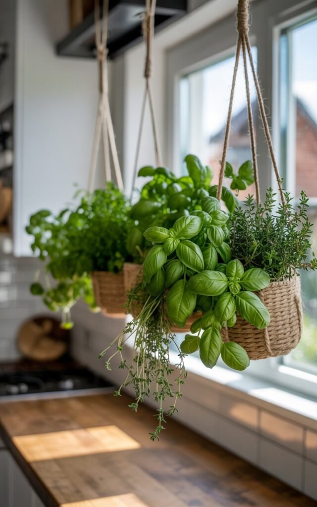 Hanging planters or macramé holders, lightweight potting mix, a few small herb plants (basil, oregano, parsley, and sage work best), and hooks or rods for hanging.