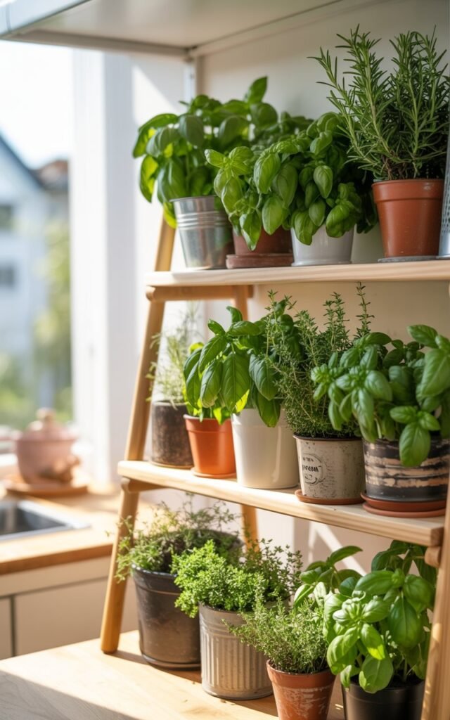 If you have limited counter space, a tiered shelf herb garden is a smart solution. It allows you to grow multiple herbs vertically, keeping everything organized and accessible.
