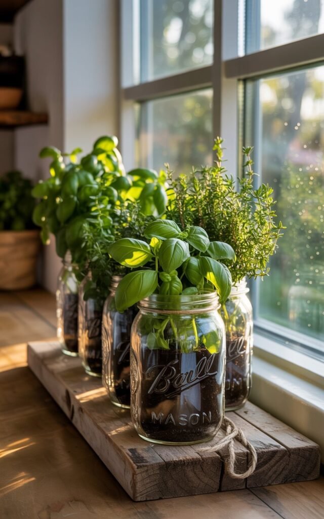 If you love rustic or farmhouse-style décor, mason jar herb planters are the perfect touch.