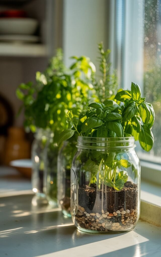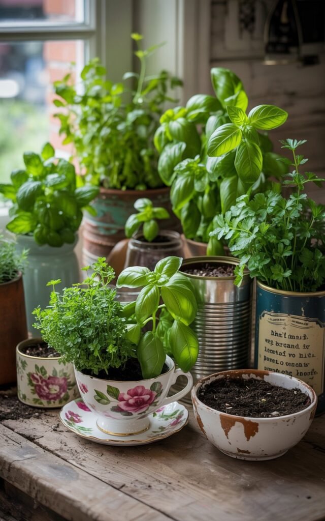 Get creative by using old tins, teacups, or even glass jars as herb planters. This method is perfect for adding personality to your indoor garden while keeping it eco-friendly.