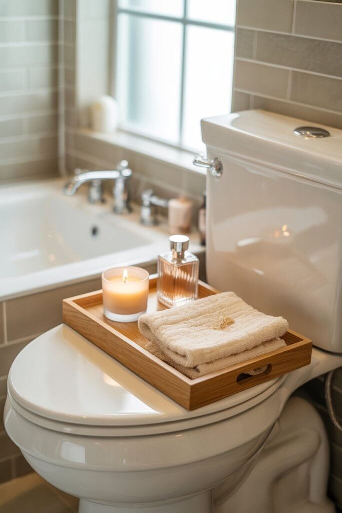 - Arrange 2–3 items max — like a candle, a diffuser, and maybe a folded washcloth.